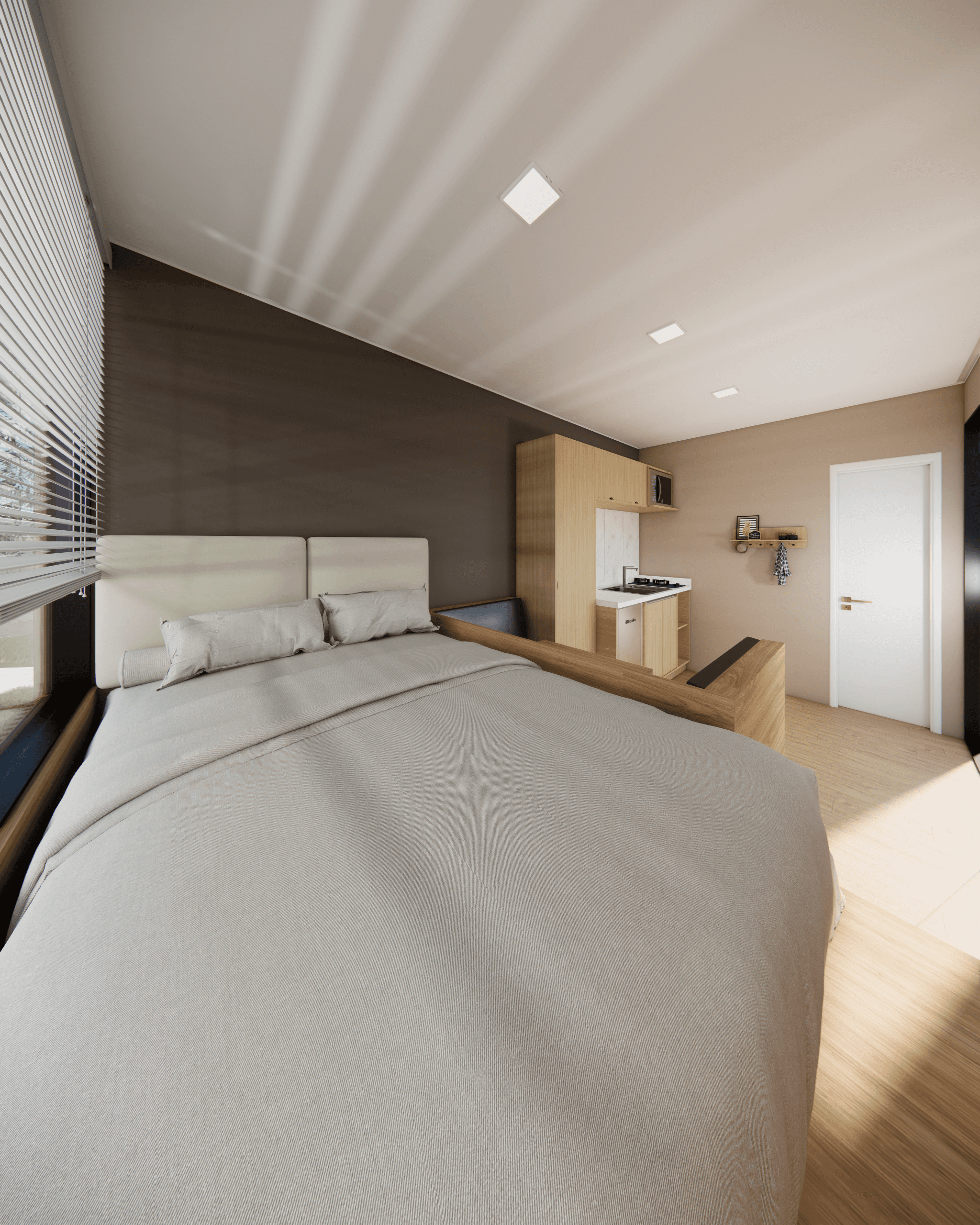 Projetado para conforto, eficiência e estética contemporânea, oferece uma experiência completa de moradia ou hospedagem compacta, com excelente aproveitamento de espaço interno e design inovador.