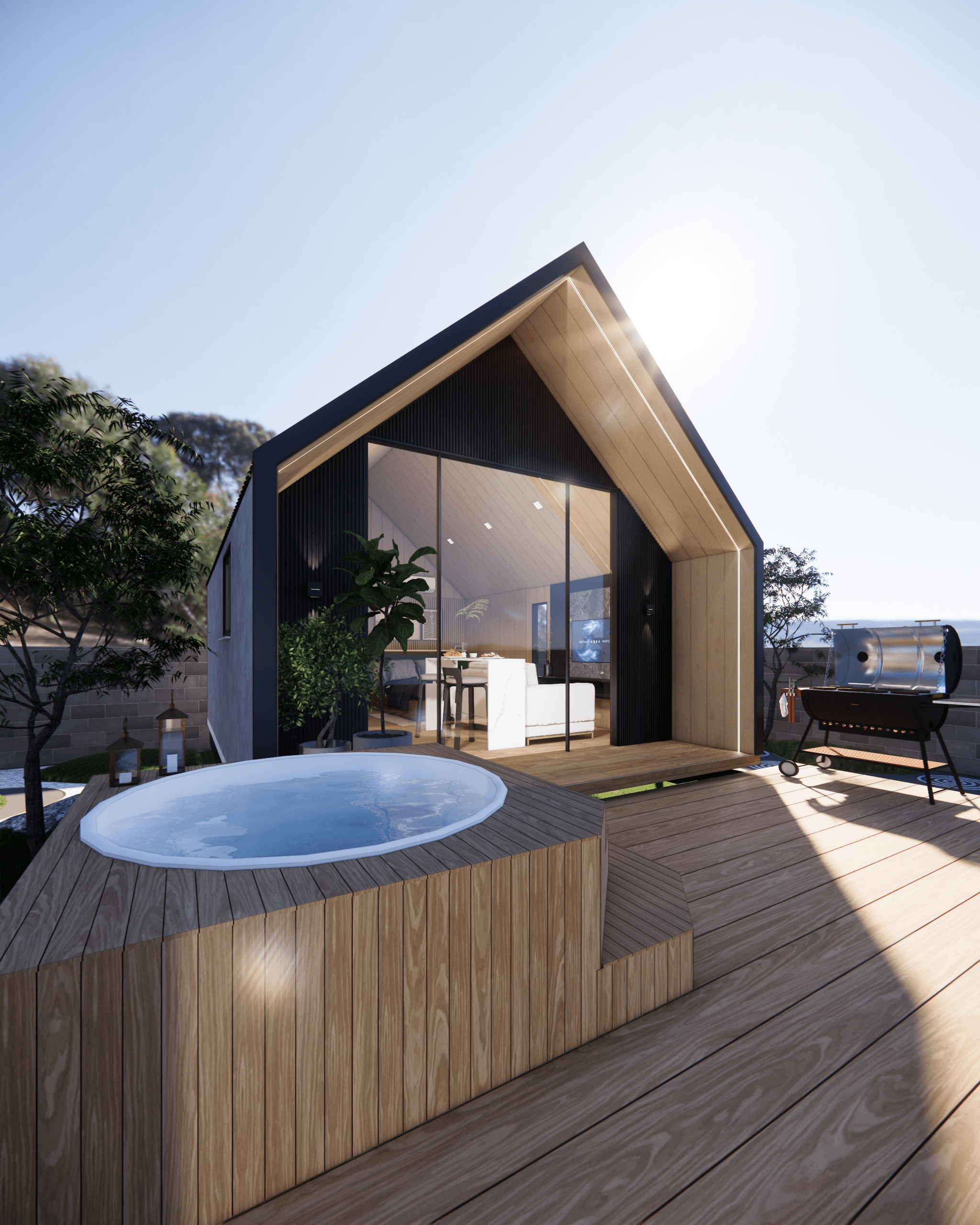 O exterior da cabana adota um estilo A-frame contemporâneo, com telhado inclinado em preto contrastando com painéis de madeira clara. As portas de vidro deslizantes na frente permitem entrada abundante de luz e ventilação natural, enquanto as laterais garantem privacidade. A estrutura é robusta, com materiais resistentes a intempéries, e pode ser adaptada para diferentes climas.