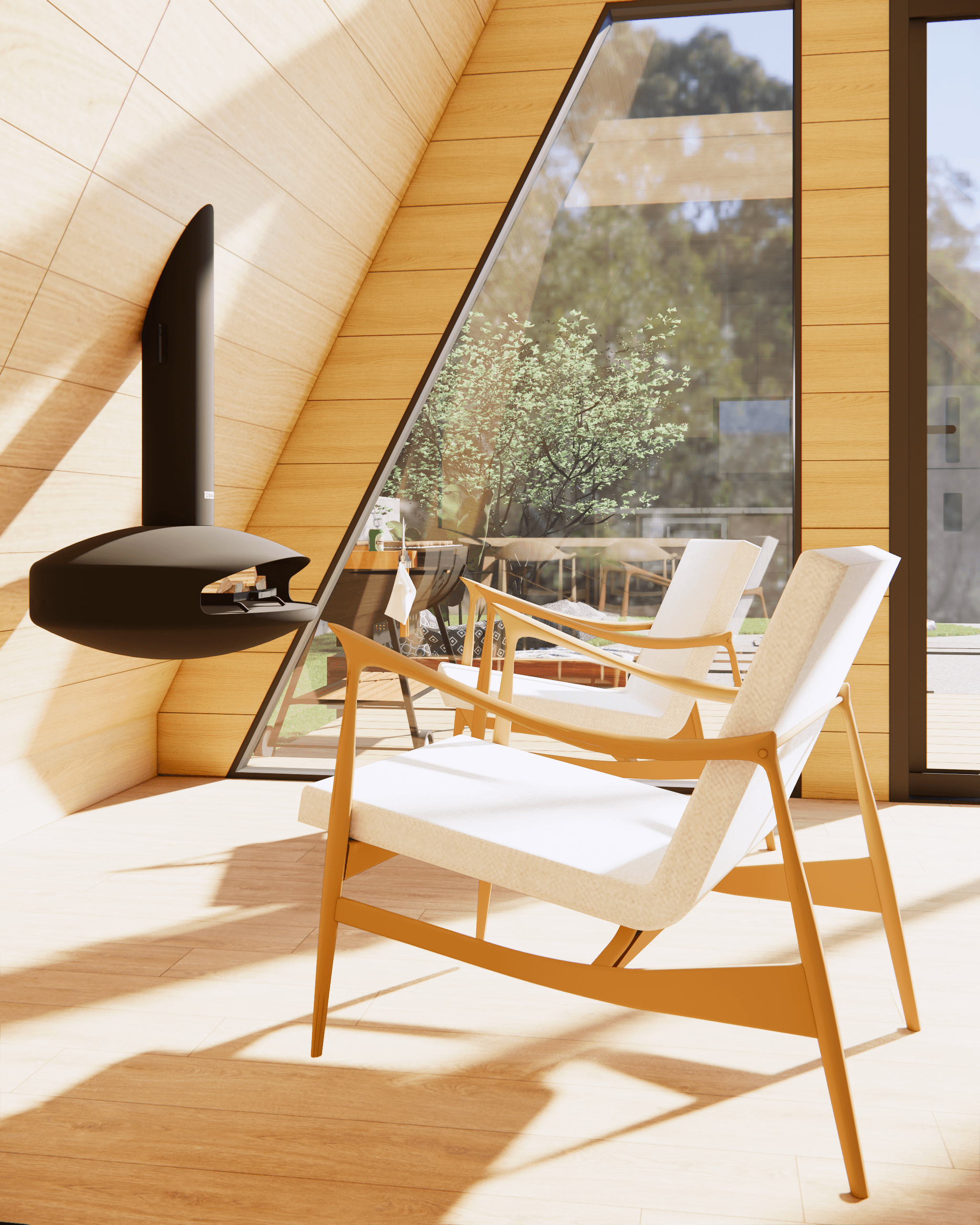 Com design moderno, amplas janelas de vidro e portas de correr que integram o interior à paisagem, o chalé proporciona uma vista privilegiada do mezanino, perfeito para apreciar a natureza. A área interna funcional inclui sala, cozinha e banheiro, enquanto o mezanino é ideal para descanso. Perfeito para residências, refúgios de fim de semana ou aluguéis, ele pode ser personalizado de acordo com suas necessidades